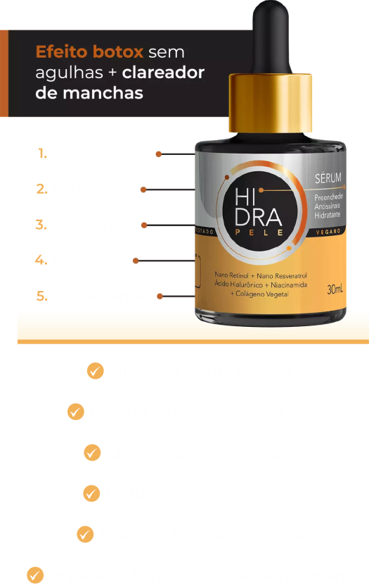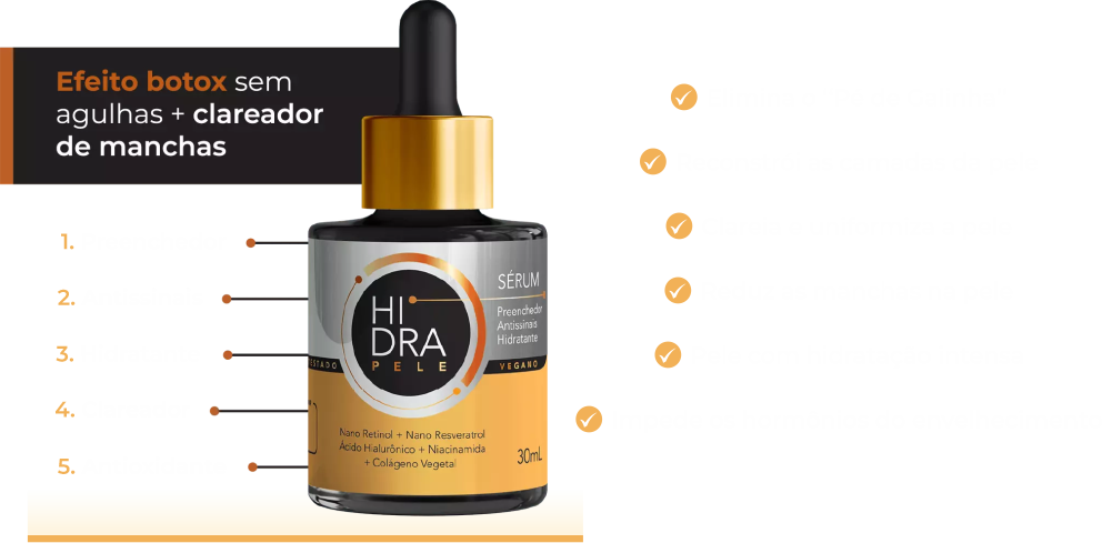 O Sérum HidraPele acelera a renovação celular, deixando sua pele mais jovem e saudável ao longo dos anos. Não se preocupe mais com as mudanças negativas que a idade traz – experimente e se sinta mais confiante e atraente a cada dia. Não deixe a idade definir sua aparência – descubra uma nova e mais jovem versão de si mesmo(a)